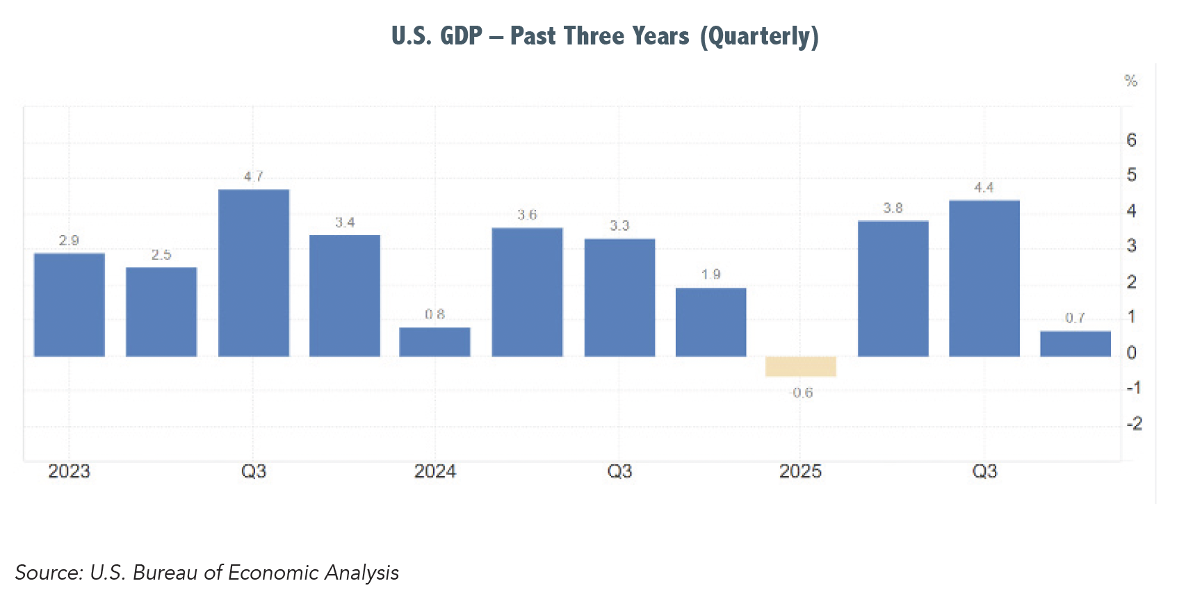 After years of stellar, narrow leadership by mega-cap technology stocks, Q1-26 marked a rotation in favor of value, small-cap and international equities. As broad U.S. indices pulled back, geopolitical conflict in the Middle East—specifically involving Iran—triggered a massive surge in energy and commodity prices, which became the quarter's standout performers. While the U.S. economy remained surprisingly resilient, expanding at a projected 2.0% to 2.6% rate, the quarter was marked by increased volatility, spurred by intensifying geopolitical conflict in the Middle East and sticky inflation.